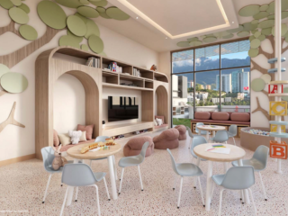 Adicionalmente, en el piso 8 estarán ubicadas las amenidades con vistas a la ciudad. Como amenidades interiores tendrá: Sala Lounge, espacios de cowork, también salón de eventos, además, ludoteca, sport bar, Gimnasio con terraza de Yoga. Amenidades exteriores tendrá: alberca, chapoteadero, asoleadero, área de asadores, jardines con juegos infantiles, pet park, canc ha multiusos, terrazas, áreas sociales y lobby.